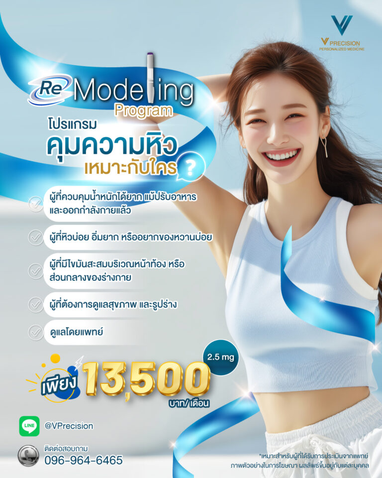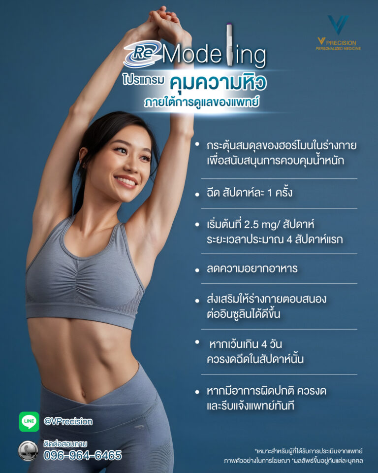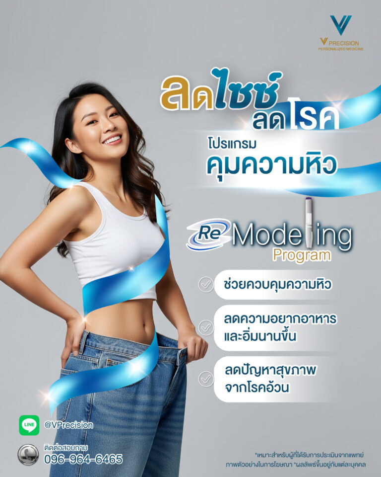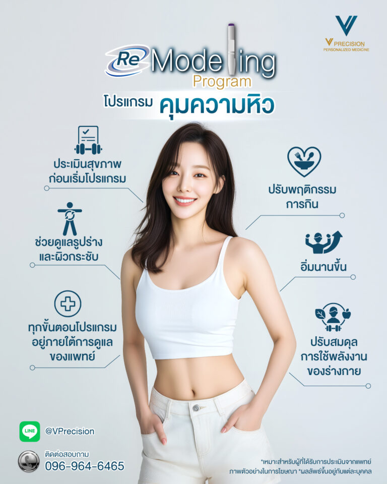 เหมาะสำหรับผู้ที่ควบคุมอาหารได้ยาก หรือต้องการจัดการภาวะดื้ออินซูลิน โปรแกรม Re Modeling Program นี้ช่วยปรับสมดุลระบบเผาผลาญ และช่วยให้รู้สึกอิ่มได้นานขึ้น เพื่อสนับสนุนการควบคุมน้ำหนักอย่างปลอดภัยและเหมาะสมกับแต่ละบุคคล ที่อยู่ภายใต้การดูแลโดยแพทย์