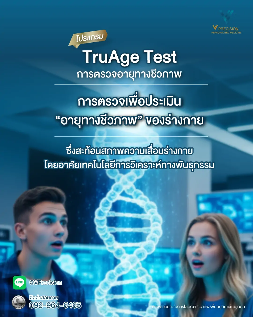 โปรแกรม TruAge Test คือการตรวจวัดอายุทางชีวภาพ (Biological Age) เพื่อประเมินอายุของเซลล์และเนื้อเยื่อในร่างกาย ผ่านการวิเคราะห์ “methylation” บน DNA ซึ่งสะท้อนถึงอัตราการเปลี่ยนแปลงของเซลล์และระบบต่าง ๆ ในร่างกาย